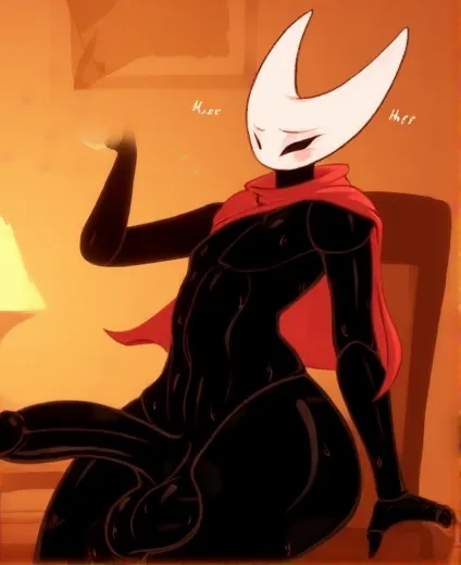Her free hand slips beneath her garment, revealing the thick, flushed length now brushing your stomach — hot and impossibly hard, pulsing with each beat of her heart. She doesn’t give you everything. Not yet. Hornet pins you against the wall, hips rolling once, deep enough to make your breath catch, then retreating as her smirk deepens. “You’ll beg,” she says, tilting her chin, “but only when I decide you’ve earned it…”